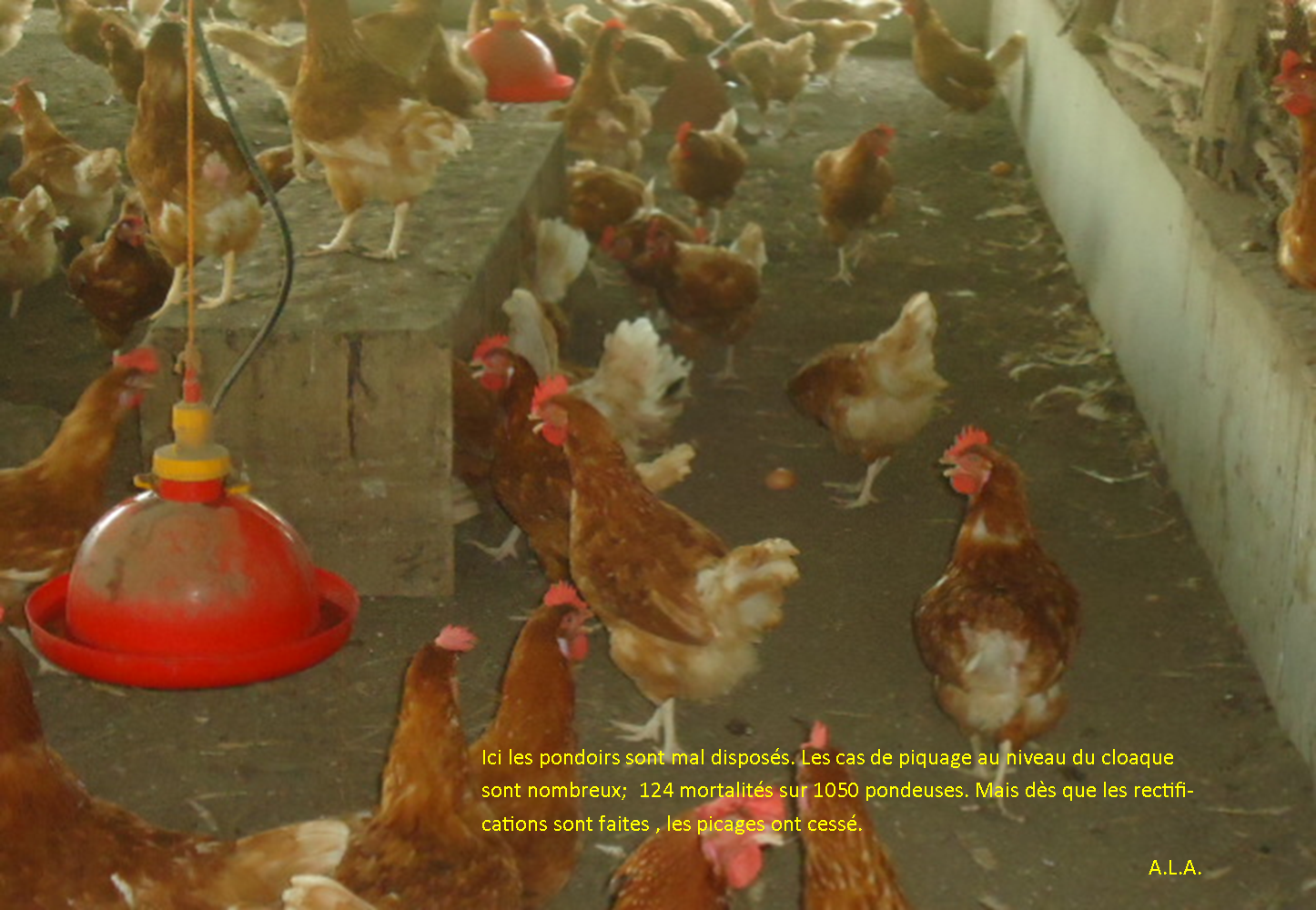 Toutes les poules se ruent vers les pondoirs bien situés et abandonnent les autres mal situés. Celles qui se trouvent en bas s’étouffent et meurent par asphyxie.