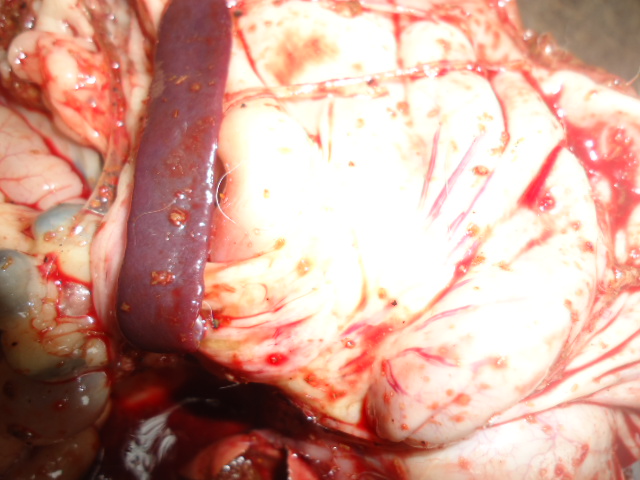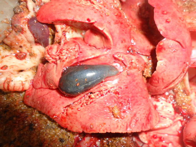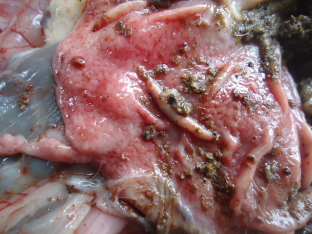 On aurait pensé en premier lieu à une intoxication alimentaire. On observe un météorisme, un liquide jaunâtre s’écoule de l’urètre lorsqu’on presse l’abdomen. A l’autopsie, on constate une accumulation de gaz dans les caeca (expliquant le météorisme), le foie est décoloré, friable et présente un aspect cuit. Les canaux hépatiques sont fortement irrigués, on constate une hypertrophie de la vésicule biliaire. On note une érosion de la membrane interne de l’estomac et la membrane externe est fortement irriguée. La rate est