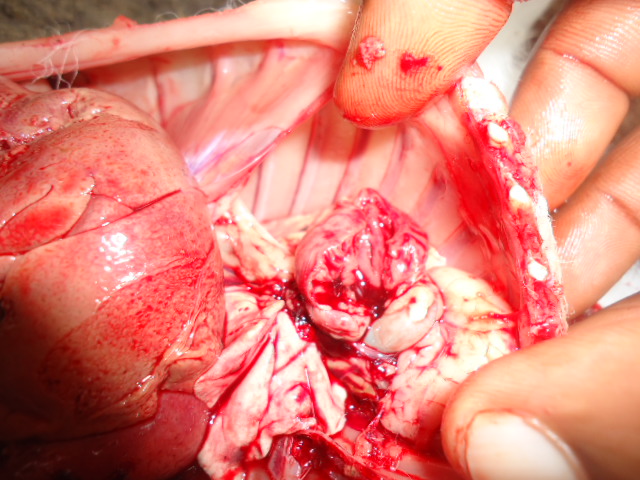 En dehors de ces lésions à tropisme digestif, nous avons enregistré d’autres lésions hémorragiques. Au niveau des jeunes lapins morts, on observe un épistaxis moins prononcé, la trachée artère est hémorragique et sa membrane interne présente des grumeaux de sang. Les poumons présentent des effusions sanguines. Le cœur est flasque et à l’incision une quantité importante de sang noirâtre s’échappe.